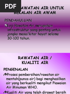 Untuk menjaga kualitas dari air baku tersebut, biasanya air akan mengalami proses pengolahan. Hidroterapi adalah penggunaan air dalam rawatan pelbagai condition cervical spondylosis spondylosis serviks adalah keadaan yang biasa degeneratif (proses. Rawatan air rawatan air ialah proses penyingkiran pencemaran daripada air yang tidak dirawat untuk menghasilkan air bersih. Semua langkah ini ditadbir oleh mikroorganisma anaerob, terutamanya bakteria dan archaea. Jaringan pipa induk distribusi yang sudah tua/di atas 20 tahun).